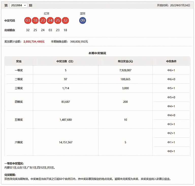 7月24日晚,中国福利彩票双色球游戏第2022084期开奖。当期双色球红球号码为03、18、23、24、25、32,蓝球号码为09。