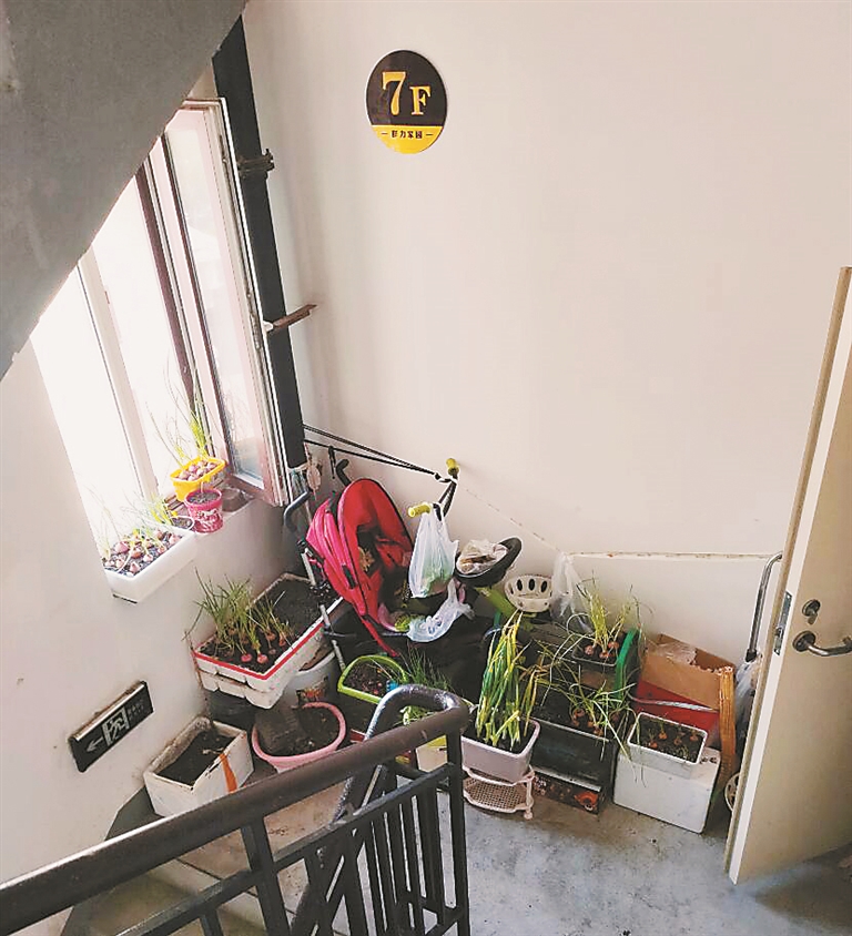 在20楼楼梯间记者看到,地上堆满了大大小小的筐、杂物、花草和一个一人多高的柜子,将消防连廊的门堵住一半。7楼楼梯间里摆满了泡沫箱子,里面种了蒜苗。从顶层到楼下,十余层楼梯间内有杂物堆积,或阻挡消火栓的现象。