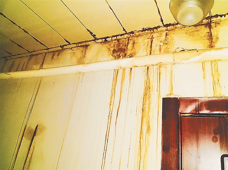 27日,记者来到建设街15号看到,此处一楼与地下室是商铺,二楼往上是住宅。王女士告诉记者,因为前两天下雨,现在屋里有些墙还是湿的。记者进入地下室发现,天棚上很多墙面都是湿的,有明显被水泡过的痕迹,有的墙面因潮湿已长出黑绿色的毛,天棚的吊顶与周围的墙面部分被水泡烂;墙面上水流造成的黑黄色痕迹十分明显,地下室楼道的墙面也长满了黑毛。