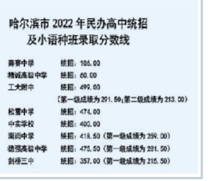 生活报讯 (记者吕晓艳) 生活报记者从哈市教育局获悉,哈尔滨市2022年民办高中统招及小语种班录取分数线发布,其中哈工大附中最高,统招499分,比去年高160分。
