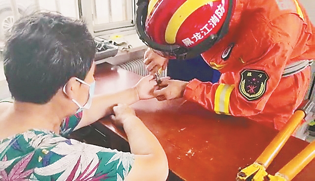 生活报讯 (记者肖劲彪) 28日9时41分,齐齐哈尔讷河市一中年女子戴的戒指卡在手上无法取下,消防员赶到后通过剪切帮其取下。