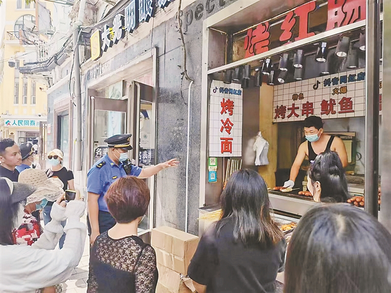 联合行动中,道里区市场监督管理局对中央大街烧烤类窗口进行检查,现场发现从业人员未能提供健康证、食品裸露摆放、食品从业人员未按规定着装、无食品经营许可证从事食品经营行为等问题,共下发整改通知书13份。道里区综合行政执法局对中央大街烧烤类窗口牌匾问题进行检查,现场对无审批牌匾予以拆除;对于西三道街与中央大街交汇处建筑红线内商户要求暂停营业;对于百盛十字广场内餐饮档口经营外溢问题,组织执法人员进行规范。 道里消防救援大队对中央大街烧烤类窗口消防安全隐患问题进行检查,共检查烧烤类窗口10家商户,发现大部分商户电器线路敷设不符合规范,个别商户存在违规使用煤气罐现象,现场已责令其立即整改。
