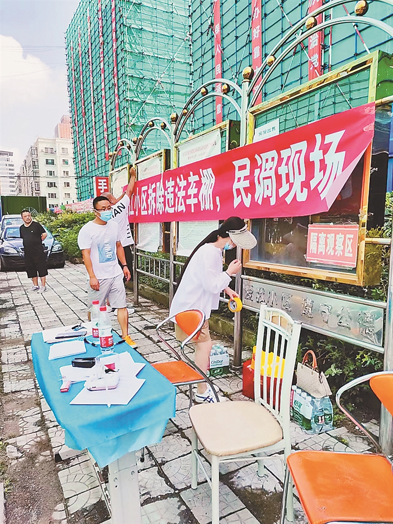 7月28日,记者再次来到闽江小区发现,在《限期拆除决定书》上清晰地写着:责令2022年7月25日前自行拆除,逾期不拆除的,将依法强制拆除。“新春街道办给了最新的说法,说是要进行民意调查,三分之二的业主同意拆才能拆。”业主张女士说。谈到这次民调,业主们纷纷质疑,“当年这6个车棚属于小区的公共配套设施,是属于广大业主的,物业私建后出租时不做民调,现在要拆反而做起了民调。”