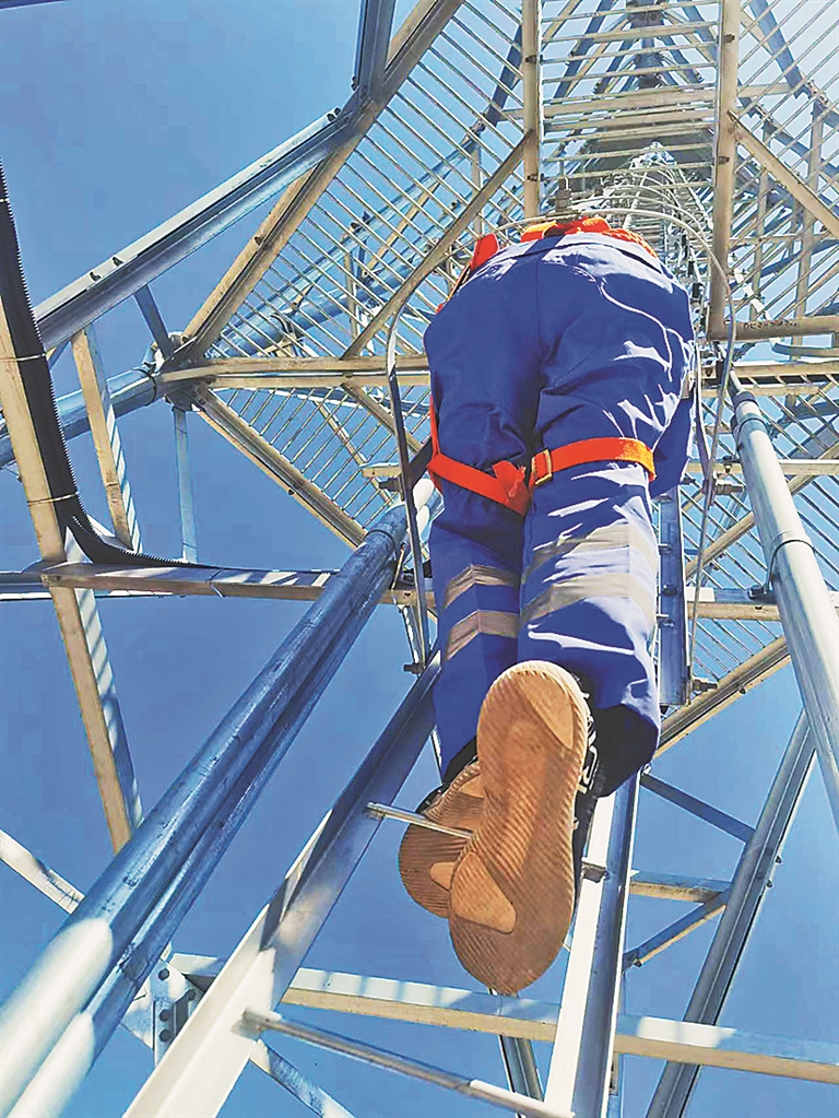 随后,记者穿上工作服亲身体验了爬塔,在地上看似简单的攀爬动作,在铁塔内的金属梯子上就不那么容易了,抓住晒得滚烫的梯子,手脚并用向上攀爬,需要上肢力量及上下肢协调。记者爬到将近10米高的第一个平台时,就感觉下面说话声小了很多,身心高度紧张下,体力消耗非常快,记者就此下塔。脱下工作服时,后背已经完全湿透,也喝掉了一瓶水。“夏季爬塔一定要避开午后的时间,不然很容易中暑。” 潘玉龙说。
