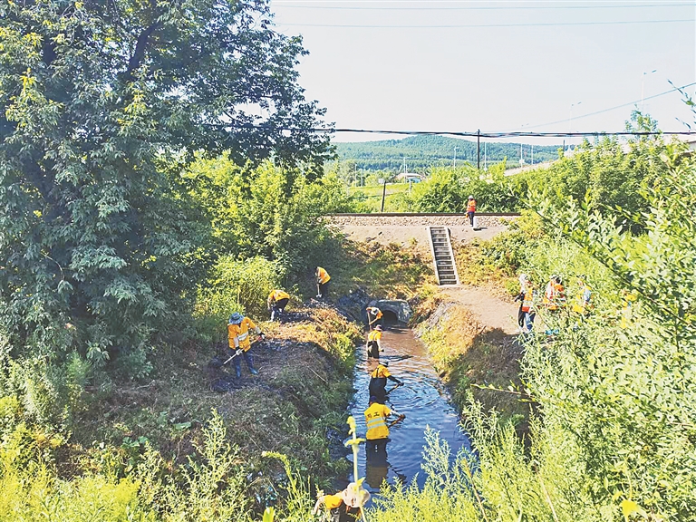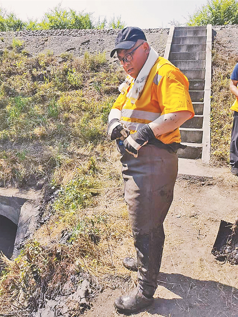 3日8时20分许,记者一行来到成鸡线97.865涵洞旁看到,来自鸡西工务段的多名职工,已经穿好水叉在大泥沟里开展清淤作业。记者了解到,这处涵洞是连通山体、林地汇水面的重要泄洪通道。鸡西工务段鸡西路桥车间养修一工区工长刘纯刚,已经在这个岗位上工作十余年了,天气闷热,这位身材高大的东北大汉已经满头大汗。2020年汛期,由于河道被倒树堵塞,他穿着水叉站在齐腰的水流中清理倒树和清泥,一站就是三四个小时,带领职工提前1天完成工作,在职工心中他可是一名“虎将”。“夏天气温比较高,洞内空间狭小,机械施展不开,我们只能进去,用小桶把淤泥往外倒。”刘纯刚告诉记者。
