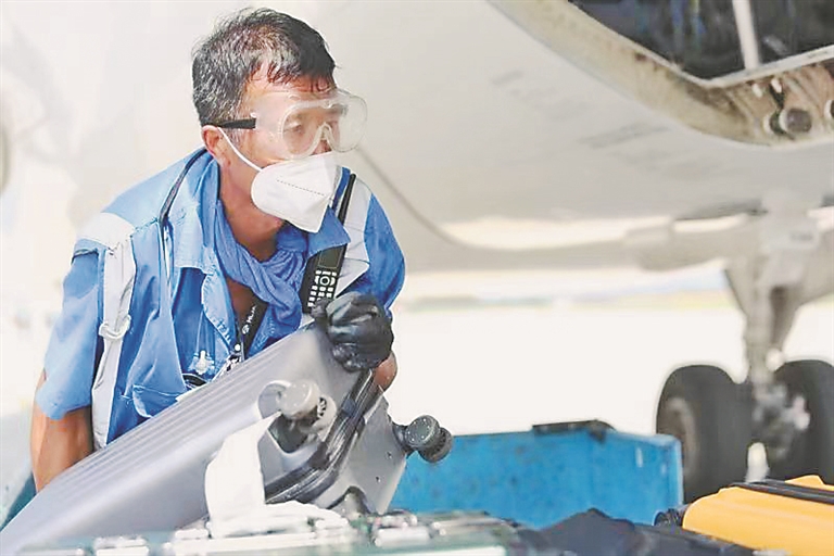 在空间狭小且极度闷热的货舱内,他们猫着腰、半蹲着身子,将到港的行李货物一件件地转卸到拖盘上,再把出港的货物行李装上飞机,所有工作要在40分钟内完成。一个航班保障完毕,劳保服已紧紧地贴在身上,像是刚从水里捞起来似的,来不及休整,便立刻投入到下一个航班的保障中……一天下来,不知道衣服湿透又干了多少回,每人能喝掉十斤水……