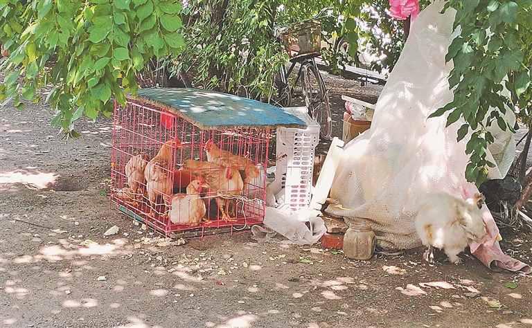 住在美晨家园的王女士说:“我家楼下有人养鸡,天天在楼下溜达,满地都是鸡屎,还有个大公鸡早上4点多开始叫。”3日,生活报记者来到美晨家园看到,小区西门附近的绿地里有不少溜达鸡,绿地边缘有一个鸡笼子,笼子里有几只母鸡,一只黑色的大公鸡趴在树下乘凉。附近人行道上有一些污渍,住在楼上的刘先生说:“这都是鸡屎,不注意就踩一脚,挺烦人。”