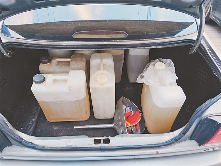 生活报讯 (记者史天一) 后备箱放多桶汽油欲给工程车辆加油……7月27日,哈尔滨市公安局呼兰分局公园路派出所社区民警在走访过程中依法查处一起非法运输危险物质案件,收缴散装汽油140余升。