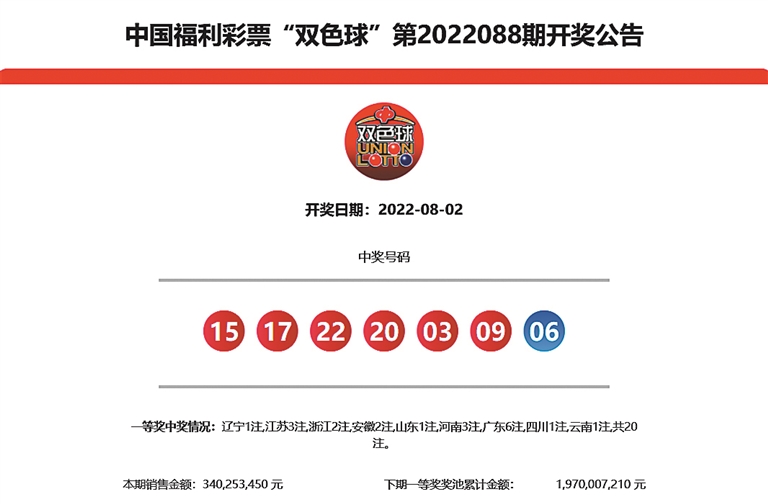 2日晚,中国福利彩票双色球游戏进行第2022088期开奖,本期双色球红球号码为“03 09 15 17 20 22”,蓝球号码为“06”。