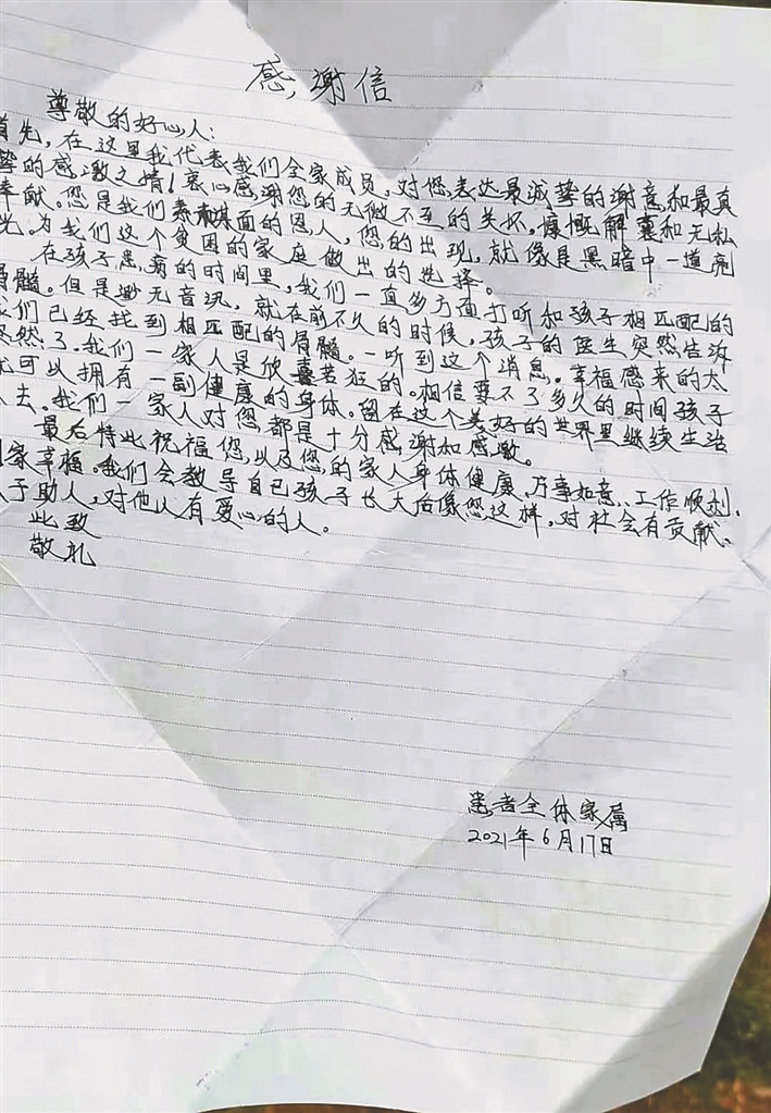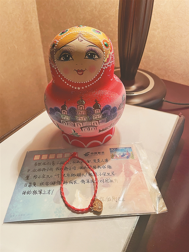 2021年6月29日,苏楠楠在哈尔滨市第一医院完成了造血干细胞采集,共采集132毫升造血干细胞混悬液。这份沉甸甸的礼物搭上前往北京的航班,被送往患儿医院,延续患儿生命,为他点亮生的希望。“虽然我们素不相识,从未谋面,但我希望用我的能量,换你一个快乐的明天,希望你健康成长,将来成为对社会有用的人!”这是苏楠楠给受助小男孩写的一封信,她还准备了一个套娃送给小男孩。“那个套娃上的图案体现了咱们哈尔滨的地域特色,我希望他会喜欢。”