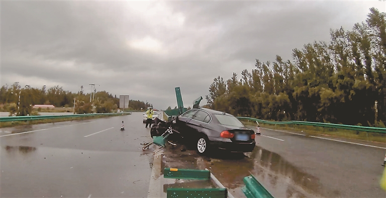 生活报讯 (记者何兴丽) 5日8时,省公安厅高管局哈牡大队事故二中队接到大队指令:在哈牡高速333km+400m处,一辆事故车横于路边,情况十分危险。接到指令后,民警赶至事发地点,只见一辆宝马轿车车头已经损坏,高速公路中央隔离带大片损毁,车内无人,驾驶员不知去向。