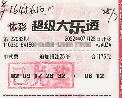 生活报讯 (尚晓) 7月25日晚,一位男士带着爱人和孩子一起来到福建体彩中心,他凭借25倍投追加单式票命中了22083期大乐透追加二等奖25注,奖金合计164万余元!遗憾的是,他因一号之差错失追加头奖,按单注追加奖金最低900万元计算,无奈与2.25亿的巨奖擦肩而过!