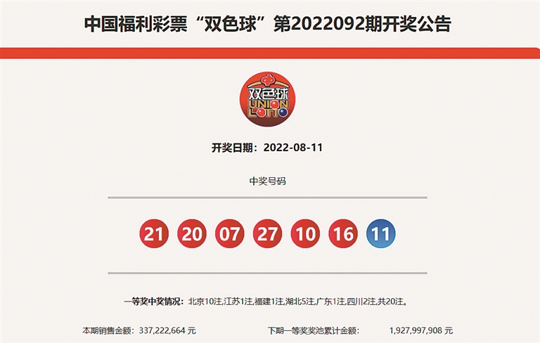 8月11日晚,中国福利彩票双色球游戏第2022092期开奖,本期双色球红球号码为07、10、16、20、21、27,蓝球号码为11。
