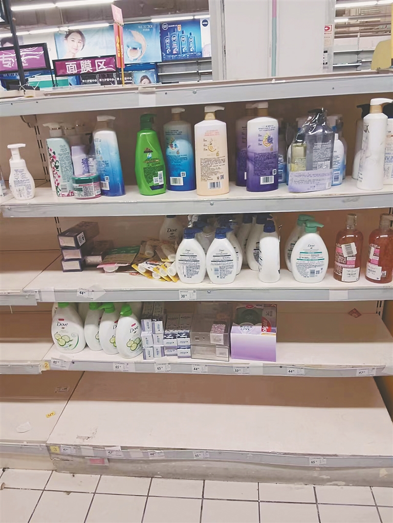 随后,记者来到美妆区,这里原本应该陈列很多洗漱用品,现在只剩下一面墙的牙刷牙膏和几排货架上的沐浴露、洗手液,生活区的尽头是家纺店和床上用品店,虽然还没收拾完,但是里面的货物不供顾客挑选。