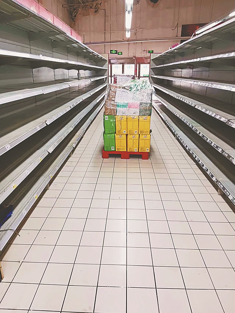 随后,记者进入超市内部,按照流程进行扫码测温,超市分为内外两个部分,内部是购物中心,外部有美食街和一些小档口,而现在美食街只有几个档口在营业,之前这里特别热闹,人多的时候人挤人转不开身。进入内部购物区域,门口有一家雪茶还在营业,因为能送外卖,生意还算不错。放眼望去,大片大片的货架上都是空的,有一些区域还拉上横条标明此处禁止入内。食品区、蔬菜区、生鲜区、冷冻区、家用电器区都已经清仓,工作人员把商家的货物打包装进纸箱登记在册后,通知运输的工作人员运走。