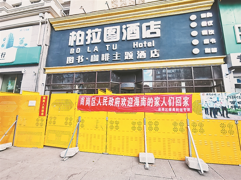 15日下午,南岗区柏拉图酒店门外的黄色围栏上悬挂着“南岗区人民政府欢迎海南的家人们回家”的横幅。据南岗疫情防控常态化隔离转运专班组长、南岗区委常委、区委政法委书记温洪宇介绍,他们13日凌晨接到电话,第一批滞留海南的游客要返回哈尔滨。隔离转运专班立即投入工作状态,随即启动了应急预案。