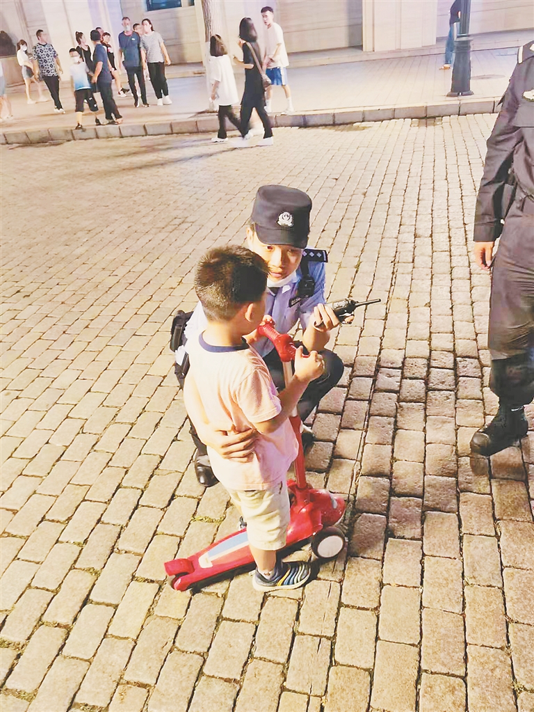 据民警介绍,夏季是适合游玩的季节,中央大街每天游客较多,偶尔会发生孩子和家人走失的情况。“之前有一次我和同事正在中央大街巡逻,突然接到对讲机里传来消息:一名四岁男童走失,身穿粉色半截袖,脚蹬红色滑板。”