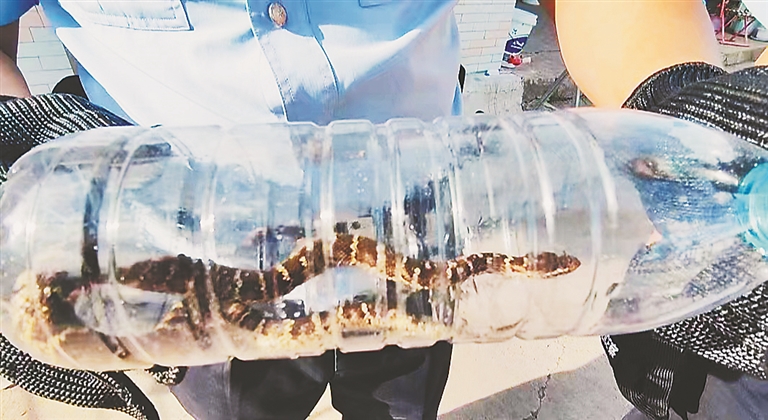 17日16时许,派出所接到辖区村民袁某某报警求助称,其在院子中晾晒农作物时,无意中发现墙角处有一条蛇。接警后,民警立即驱车赶往村民家中。据副所长孙运鑫介绍:“民警在居民晾晒农作物的院子墙角处发现一条黑黄花的野生蛇,当时这只蛇还在爬动。民警到场后不敢有丝毫疏忽,带好防割手套,运用捕捉网,成功将其捕获并放到矿泉水瓶中。”