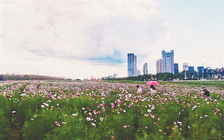生活报讯 (记者李丹)市民游玩休闲又添好去处,近日,哈尔滨新区滨水大道南侧绚丽的波斯菊竞相绽放,连成一片花的海洋,美不胜收,邀您来赏花打卡。