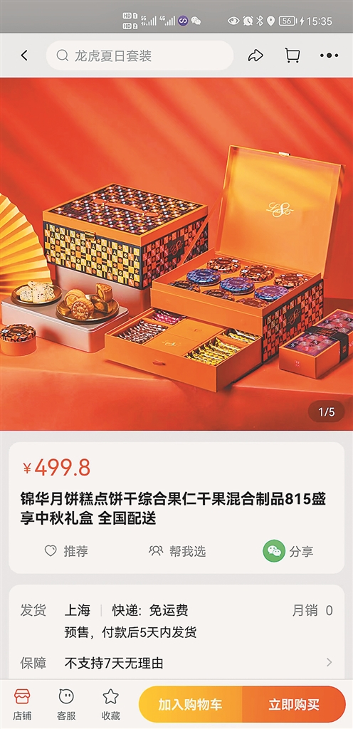 在一家名为“彩虹宝殿”的淘宝店铺,一款价格为499.8元的月饼礼盒内,除了传统的月饼外,还“内置”了开心果、凤梨酥、饼干等食品。按照新规中“月饼不应与其他产品混装”的规定,该礼盒显然不符合要求。