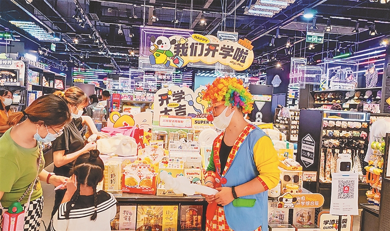 “我们开学啦!”上周末,朝阳区某商场的一潮品店入口处挂着色彩鲜艳的招牌,招牌下的货架上,汉堡形状的笔记本、幻灯片笔等商品摆放在中心位置;一旁,工作人员热情地为顾客做着介绍。
