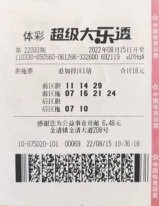 当天晚上,赵先生来到常去的体彩实体店,购买了一张“前区3胆4拖”的胆拖追加票。当晚开奖后,他接到了实体店代销者的电话。“我当时没有立刻查开奖信息,一听有电话,还跟我爱人开玩笑说,不会是通知我中奖的吧,结果还真是报喜的!”