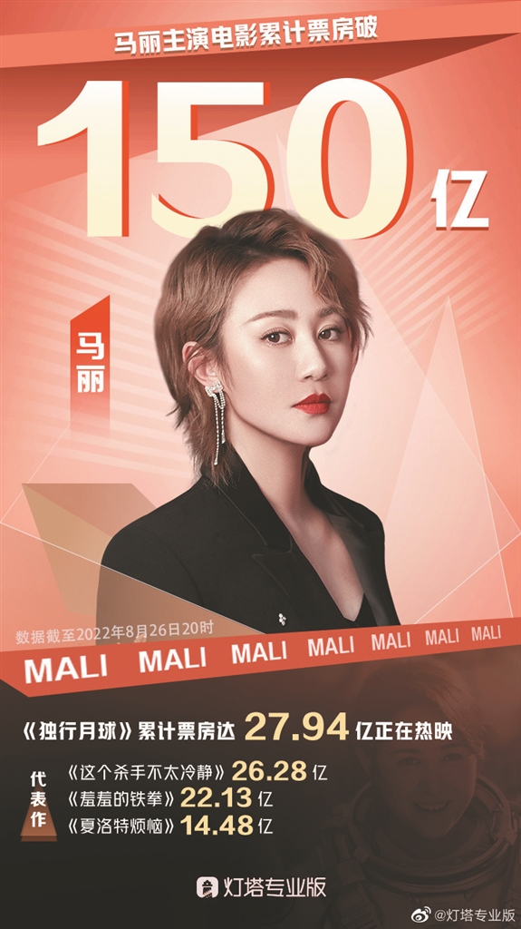 生活报讯(综合)近日,据灯塔专业版数据显示,截至2022年8月26日20时,演员马丽主演电影的内地累计票房突破150亿。马丽也是中国电影市场主演票房最高的女演员。