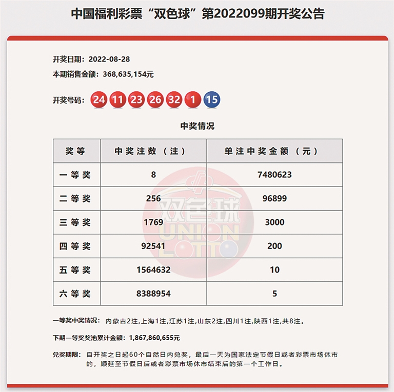 八月接近尾声,彩市又传来喜讯。8月28日,中国福利彩票双色球游戏第2022099期开奖,当期开奖,全国喜中8注一等奖,256注二等奖,一起来看看详情吧。