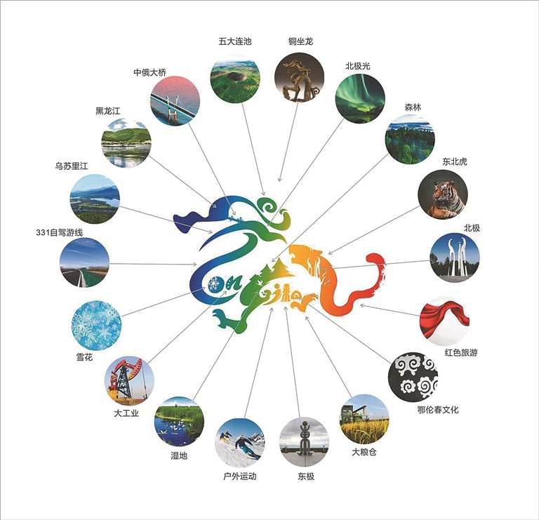 龙头部分融入五大连池、黑龙江、乌苏里江和极光元素,通过写意的手法将三者的轮廓特点与LOGO整体结合;在龙头处加入一带一路黑河中俄大桥的轮廓形象;龙颈处选用了代表黑龙江冬季旅游的雪花、象征“大庆精神和铁人精神”的大工业以及有着“醉美龙江331边防路”元素。