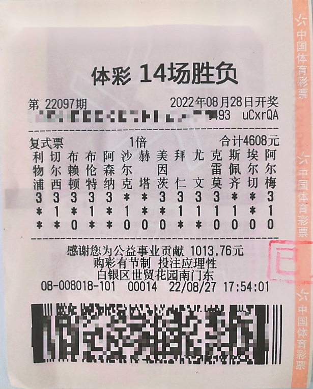 本次的中奖票是一张4608元的复式票,是刘先生和他的四位好友一起购买的一张彩票。据了解,刘先生和他的几位朋友是近几年买彩票时逐渐认识的,几人都喜欢足球,也都热衷于研究竞猜投注技巧,几人从去年开始一起合买一些复式票,投注对象以足球胜平负为主,从购买开始到现在也陆续中出过几万到几十万不等的奖金,之前最高的一次中出了102万元,这次能中出123万元,大家还是非常开心。