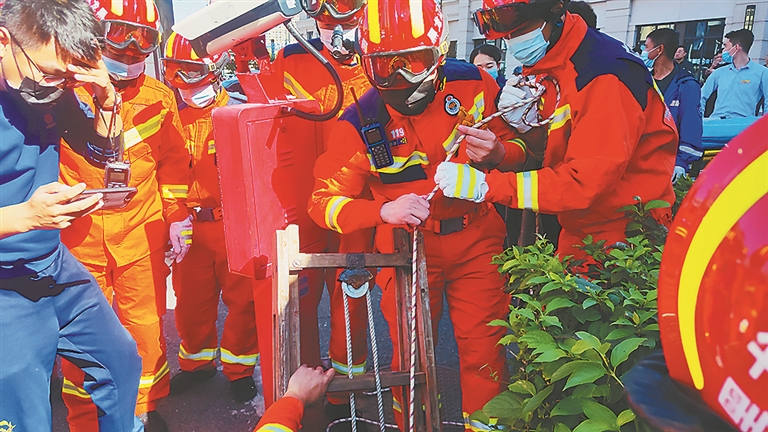 指挥中心立即调派崂山路消防救援站出动2辆消防车和8名消防救援人员赶赴现场实施救援。消防救援人员到达现场后得知,一名30岁左右的女子走路时不慎掉入小区外花坛之间半米直径的深井内,井深约6米左右。被困人员生命体征正常,可以正常行走。