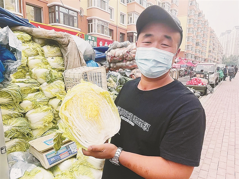 28日10时,在哈市红河路地产果蔬售卖疏导街路上,呼兰来的菜农崔新飞正在忙碌。在记者采访时,他带来的2000斤白菜销售一空。他说:“今年家里的地能产出近30万斤白菜,一般日销售量在2000斤左右。”
