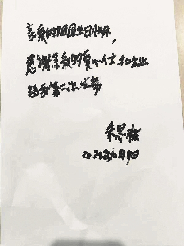国庆假期,病情有所好转,意识越来越清醒的朱思赫,在ICU里吃力地用手在纸上写下:“亲爱的祖国生日快乐,感谢亲爱的爱心人士和企业,给我第二次生命。朱思赫,2022年10月1日。”并委托护士将纸条交给父亲。