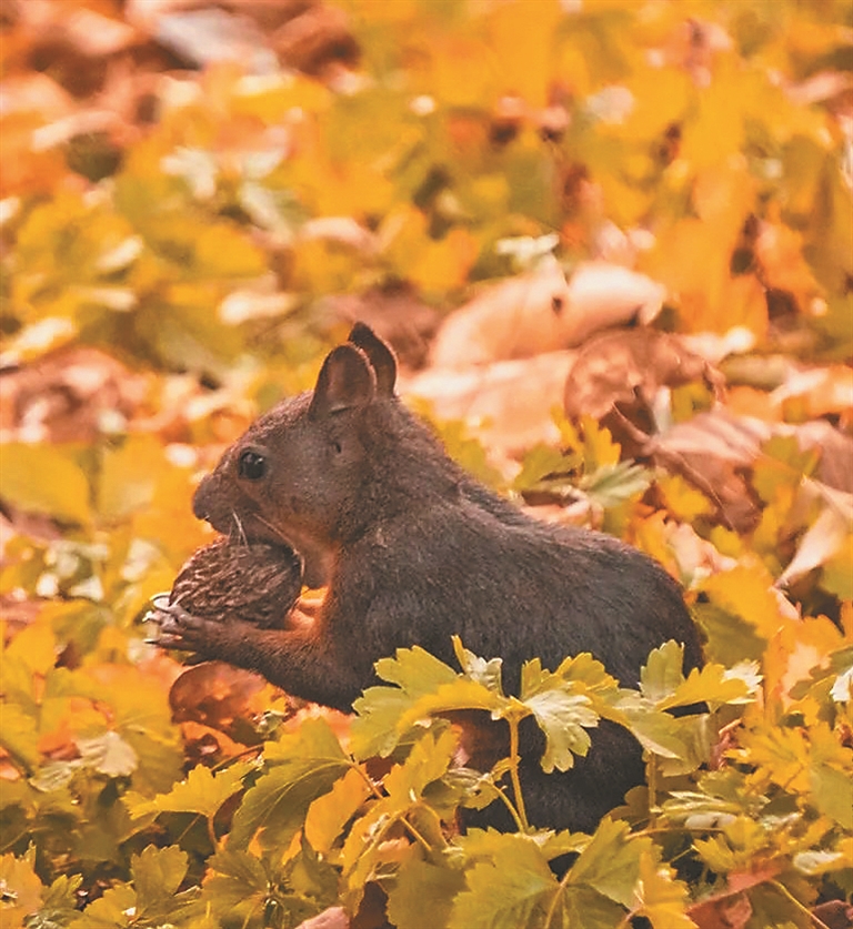 哈工程大学的学生们拿起相机,定格最美的秋色,一面小镜子放在地上,就有了“画中画”的意境,让落叶与红花同框。黑龙江大学和哈工程大学校园内的小松鼠也出来“抢镜”。