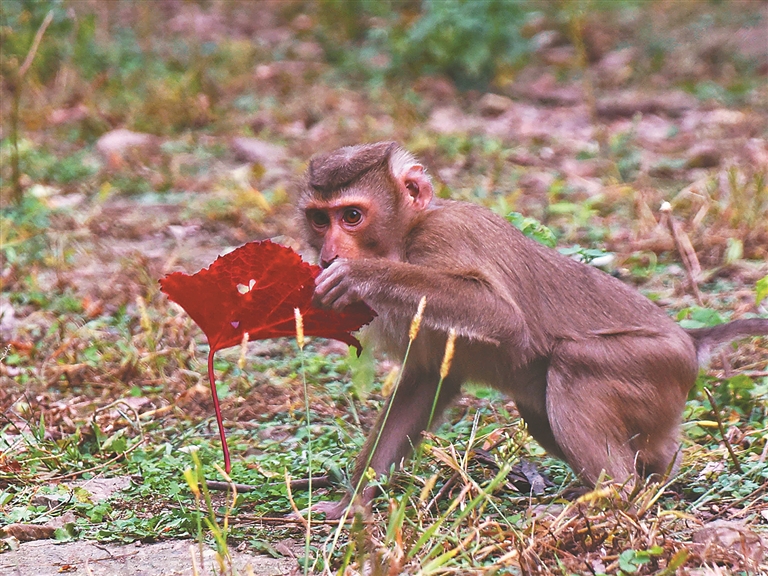 豚尾猴 “安安”已经半岁了,喜欢吃苹果、桃子、西瓜。“我最喜欢做的事是玩儿,现在天越来越冷了,我总喜欢在‘花果山’里待着,今天我发现一片非常漂亮的红色叶子,妈妈说这是葡萄叶,因为秋天到了葡萄叶子就红了。”