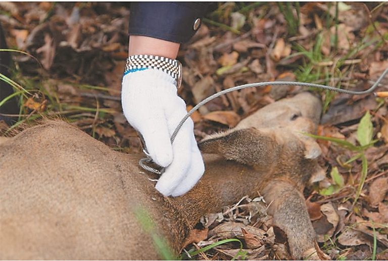 为防止狍子伤势恶化,森侦大队3名民警从3个方向向狍子缓缓靠近,通过温柔的抚摸和按摩,安抚好狍子的情绪。把受伤的狍子从钢丝套中解救出来,并立即将其送到了方正林区野生动物救助站。