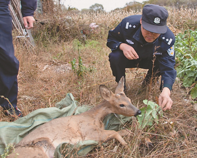 记者从方正分局获悉,7日上午,当民警行进至响河林场松花江支流河边时,“吱吱”的痛苦呻吟声吸引了民警们的注意,拨开晃动的树枝,发现是一只受伤的狍子瘫倒在小树旁。经仔细确认,小狍子年龄约1岁,身体有明显钢丝套伤,肉眼可见腰部受伤较深。小袍子已经不能动弹,那根因挣脱断裂的钢丝还死死缠绕在狍子的腿部。