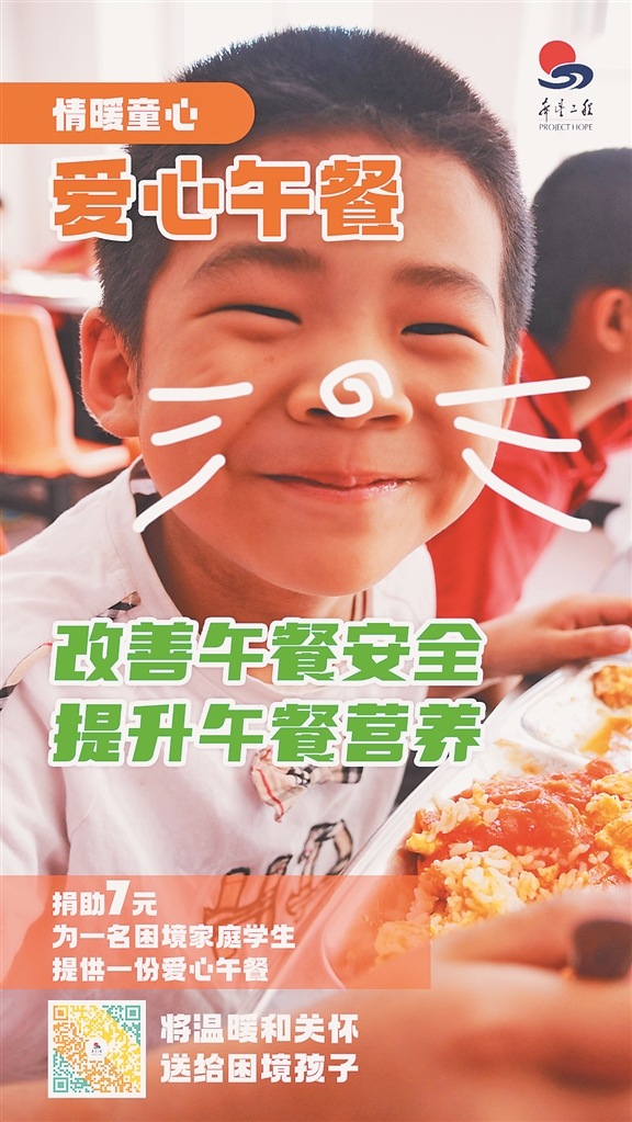 “情暖童心爱心午餐”活动就是诚邀爱心人士参与,通过社会捐助的方式,帮助农村、城镇留守及建档立卡家庭的小学生,提升午餐的营养质量,保证青少年健康成长。