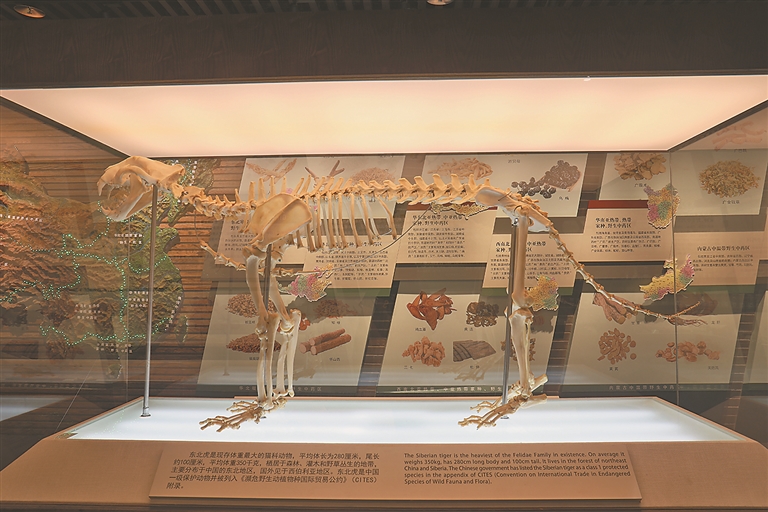 黑龙江中医药博物馆展出的这具东北虎形体标本是经国家林业局、黑龙江省林业厅批准,由黑龙江东北虎林园转赠的,它具有独一无二的身份证,证明它纯良珍贵的东北虎血统。刘思琦老师告诉生活报记者,此具标本为成年雄性东北虎虎骨,体长2.4米,高1米,宽0.5米。全身骨骼完整,品相俱佳,极具收藏和研究价值。虎骨是传统名贵中药,性温,味辛,具有固肾益精、强筋健骨等功效。正是由于虎骨的药用价值,使其长期成为狩猎对象,在一定程度上造成濒危现状。为保护濒危野生动物,我国于1993年起禁止一切虎骨贸易活动,取消了虎骨的药用标准。
