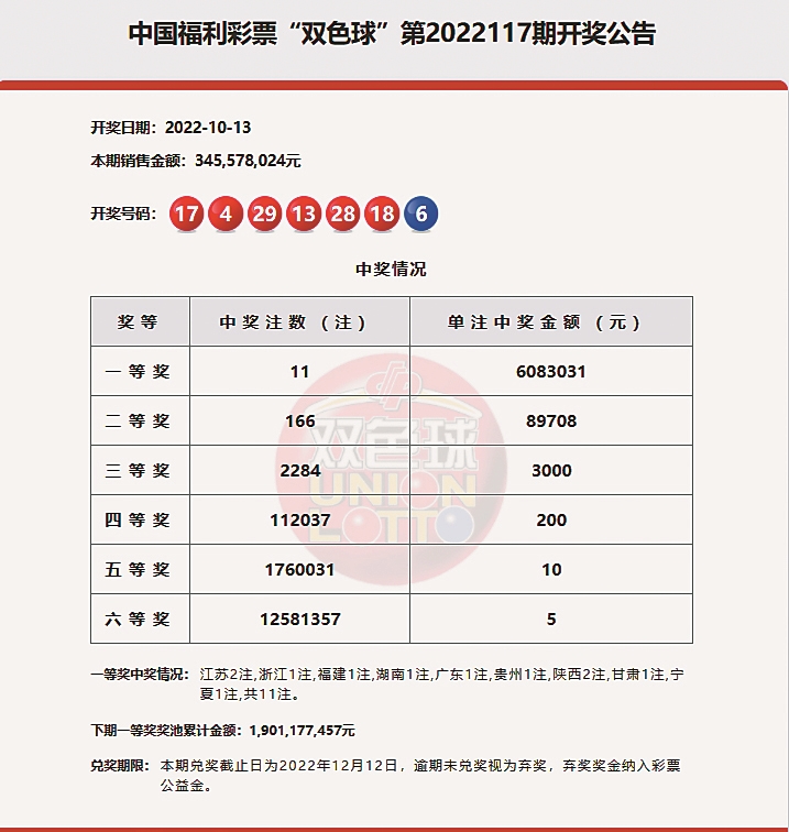 13日晚,中国福利彩票双色球游戏第2022117期开奖。本期双色球红球号码为4、13、17、18、28、29,蓝球号码为6。