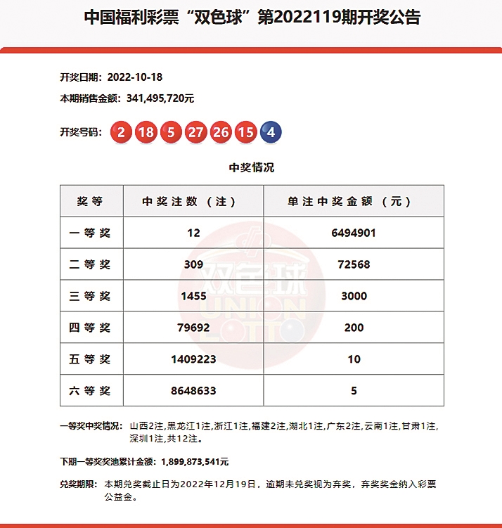 10月18日晚,中国福利彩票双色球游戏第2022119期开奖。本期双色球红球号码为2、5、15、18、26、27,蓝球号码为4。