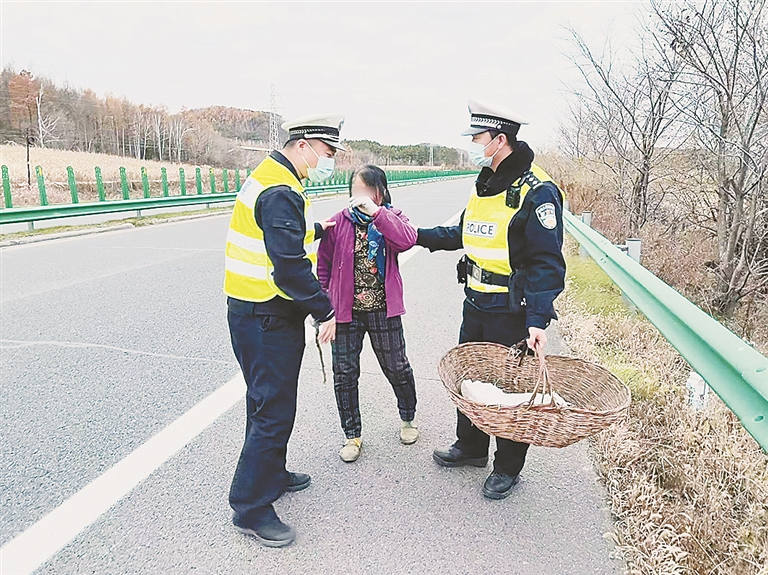 经询问,老人哭着说,自己是和邻居搭伙从家出发,到附近山里采榛子,由于中途和邻居走散,迷失方向,最后误入高速公路,感到特别害怕,拦截过往车辆想寻求帮助。