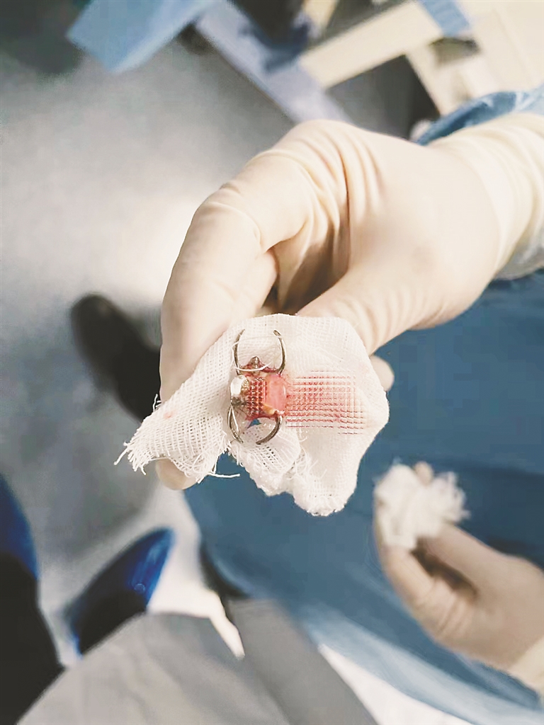 取出的假牙周围金属丝,看起来特别像只“小螃蟹”。望着失而复得的假牙,李先生也忍不住连连表示今后要注意。