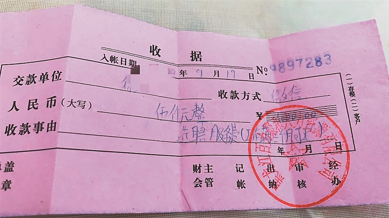 据冰城市民徐先生介绍,今年9月,他在某网站投了一份简历,想找一份驾驶员的工作。此后他接到一名女士打来的电话称:“我公司招聘司机,主要工作地点在平房,月薪6000-8000元,干满一个月有五险一金,应聘请来公司面试。”徐先生按照对方提供的地址,来到了南岗区金爵万象一期三号楼1122室。工作人员表示,工作时间是每天5点至17点,干满一个月就有五险一金,并让徐先生交了5000元押金,称是用于处理车辆违章和剐蹭的。徐先生说,当时对方的承诺是,干满一个月没有违章、车辆没有剐蹭,就会把押金退还。可交完押金后的十多天,该公司的工作人员一直以没有车为由,拒绝徐先生上班。当徐先生提出退押金时,该公司又以种种理由拒绝退还。在徐先生提供的收据上记者看到,收款事由为“选聘服务费(工作满三个月可退)”,上面还印有“黑龙江百力聚和人力资源有限公司”的公章。