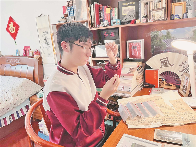 于恩钧的行为作风确实像他的文字,小小年纪的他喜爱逛古玩市场淘宝贝,喜欢修复旧物,还喜欢把文字拍成照片和视频。“曾经,我每天临睡前会把我的大褂和礼帽放在床上,想着穿越的时候会用得上。”这一刻的于恩钧才像一个高中生,轻松地自嘲着天马行空的幻想。而他之所以有这些想法,可能是和他屋里的老物件有关。