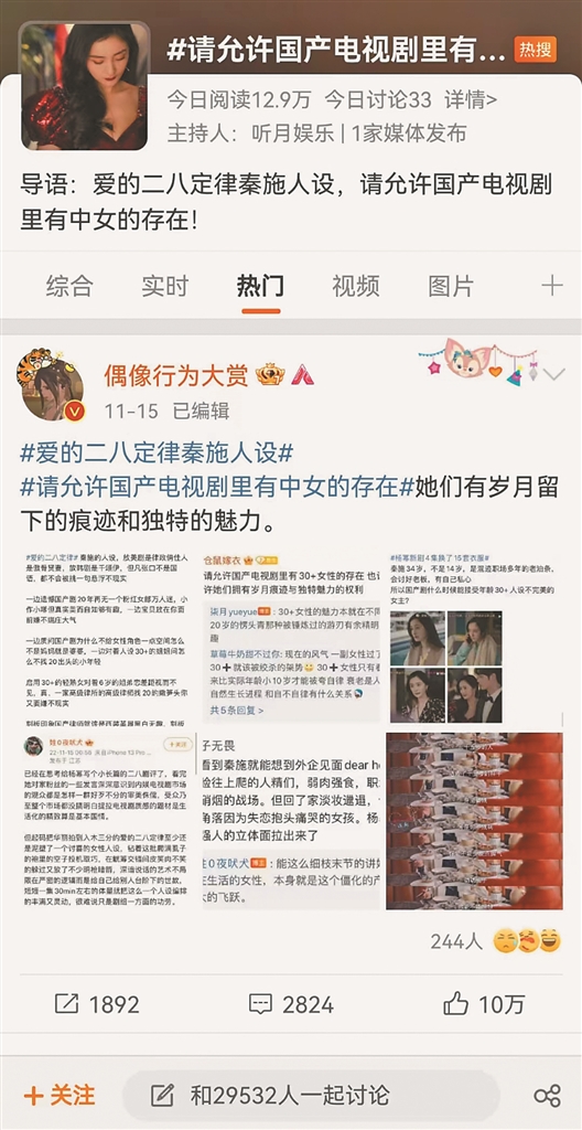 同样,正在热播的《爱的二八定律》,最近有一条“请允许国产电视剧里有中女的存在”的话题,让不少人觉得莫名其妙。点进条目才发现,说的是剧中杨幂饰演的女主人设多有现实意义。不少网友留言表示,所谓“中女”(大龄单身女)一直都是满屏飞,中年女演员中,童瑶、秦岚、刘涛、海清、殷桃等都演过时尚多金、风情万种的中年女精英?这一话题点本身就是故意炒作性别对立。