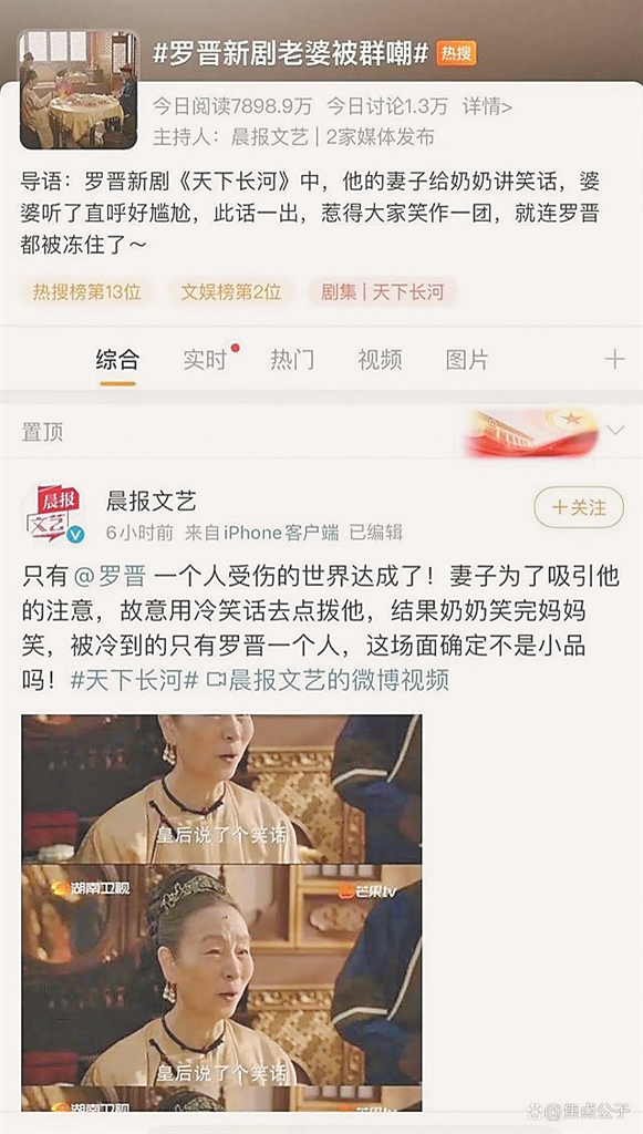 近日,演员罗晋微博发文称:“娱乐要有度,触碰到我的底线了,伤害到我的家人,对不起,不跟你们玩了。”随后罗晋删除了新剧《天下长河》的一些宣传微博,这一系列举动,被猜测是该剧的话题营销文案引发演员不满。记者了解到,《天下长河》中有一场剧情是皇后为了吸引康熙的注意,讲了一个不合时宜的笑话,现场一片尴尬。这个剧情引发了“罗晋新剧老婆被群嘲”的热搜话题,很容易让网友跑偏想到罗晋的妻子唐嫣。这种故意混淆演员和角色的营销套路,不仅引起演员罗晋的不满,也引发了不少网友的反感。