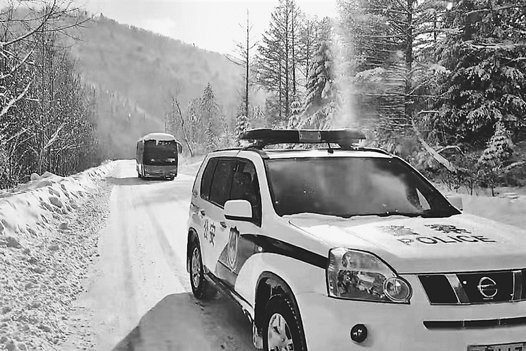 11月26日12时50分许,交警大队民警在路面执勤巡逻,发现一辆来自安徽芜湖的旅游大巴,车上都是老年游客。由于亚雪道路结冰严重,南方司机没有冰雪路面驾驶经验,不敢驾车上路,旅游团队30余人不得已滞留雪乡2天。了解情况后,交警大队立即派出警力驾驶警车前方带路,低速引导滞留旅游车辆缓慢行驶,警示其他车辆保持安全距离,1个多小时后驶出事故易发路段进入安全区间。如释重负的南方司机和游客向民警连连表示感谢。