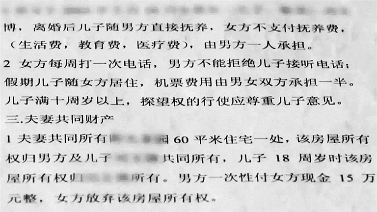 记者从哈市南岗区人民法院了解到,李某(化名)与王某(化名)于2002年登记结婚,2003年生育儿子李小某。2012年,李小某10岁时,王某与李某协议离婚,离婚协议约定包括:离婚后儿子由男方抚养,女方不支付抚养费,由男方一人承担。李某与王某夫妻共同所有哈尔滨某处60平方米房屋所有权归李某及李小某所有(李某与李小某各占50%份额),待李小某年满18周岁时,该房屋所有权归李小某所有。男方一次性付女方现金15万元整,女方放弃该房屋所有权……