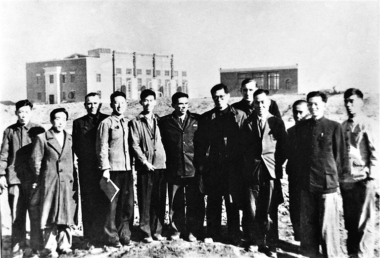 1956年,江泽民同志(左七)在长春第一汽车制造厂同援建一汽的苏联专家等合影。 新华社发